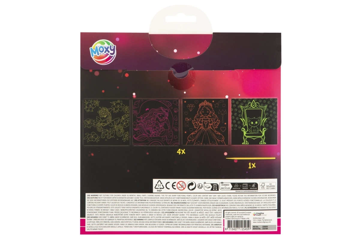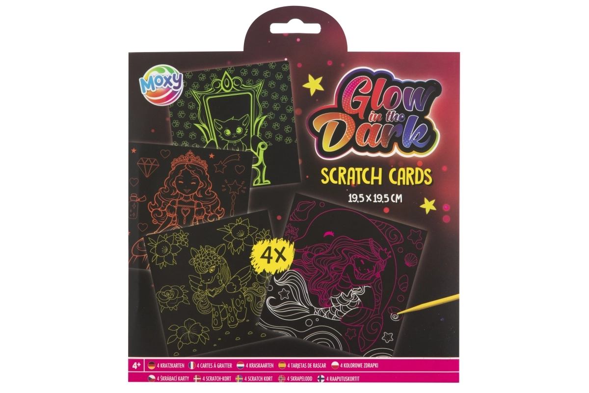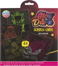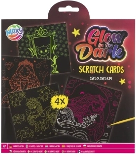 Kreatywny zestaw zdrapywanek z dziewczęcym motywem ucieszy małych twórców. Zawiera 4 szt. o wymiarach 19,5 × 19,5 cm, które po naświetleniu świecą w ciemności. Idealny dla dzieci 4+.