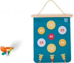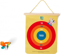 Zestaw zawiera: 1 magnetyczną wiszącą tarczę (40 × 31 cm), 4 piórkowe rzutki.