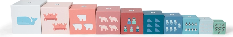 Kolorowy zestaw dziesięciu kartonowych klocków do układania pomaga dzieciom uczyć się liczb, rozpoznawać zwierzęta oraz ćwiczyć małą i dużą motorykę. Klocki w różnych rozmiarach można układać w piramidę lub ustawiać poziomo, co sprzyja zabawnej nauce i rozwojowi logicznego myślenia.