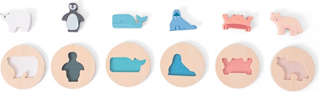 Ta wysokiej jakości drewniana wkładanka łączy zabawę z nauką. Zwierzątka – foka, niedźwiedź polarny, krab, pingwin, lis i orka – wkłada się w okrągłe żetony z obrysowym wycięciem i tym samym kolorem, co ułatwia orientację i wzmacnia rozpoznawanie kolorów oraz kształtów.