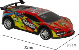 Stylowe czerwone auto RC THUNDER dla dzieci od 6 lat oferuje szybką i wciągającą jazdę w domu i na zewnątrz. Dzięki światłom LED, gumowym oponom i akumulatorowi 3,7 V jest idealne dla początkujących kierowców. Intuicyjny kontroler zapewnia łatwe manewrowanie, a kompaktowe wymiary 23 × 9,5 × 5 cm pasują do każdej dziecięcej dłoni.
