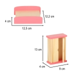 Każdy element wykonany jest z wysokiej jakości drewna, gładko wyszlifowany i pomalowany trwałymi farbami w odcieniach fioletu i różu, co zapewnia długą żywotność i bezpieczną zabawę.