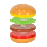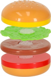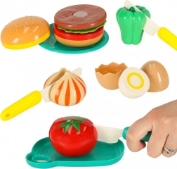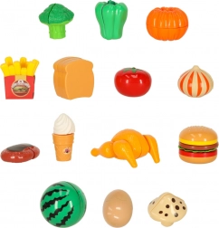Rozbudowany zestaw do dziecięcej kuchni zawiera wszystko, czego mali kucharze potrzebują: pizzę w kawałkach, hamburger, warzywa, owoce i słodkości. Elementy są podzielone na połówki i łączone rzepem, dzięki czemu dzieci mogą bezpiecznie ćwiczyć krojenie, serwowanie i przygotowanie menu dla całej rodziny.