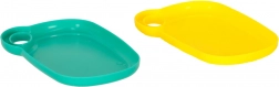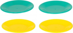 - 4× talerz, sztućce (3× nóż, 1× widelec, 1× łyżka), 2× taca, jedzenie (pizza, kurczak, papryka, mięso, pomidor, arbuz, tosty, dynia, lody, frytki, pieczarka, jajko, brokuł), koszyk z uchwytami