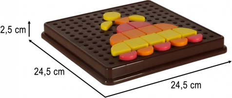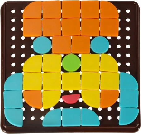 Ta mozaikowa układanka przynosi dzieciom nieskończone możliwości tworzenia. Kolorowe geometryczne elementy wkłada się w perforowaną planszę, a dzieci mogą tworzyć własne obrazki lub inspirować się dołączonymi kartami. Gra naturalnie rozwija koordynację oko–ręka, percepcję wzrokową oraz umiejętność rozróżniania kolorów i kształtów.