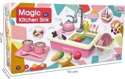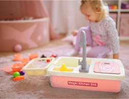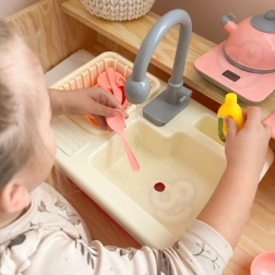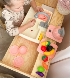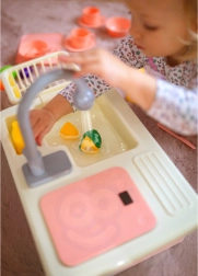 Dzieci łatwo pobawią się w kucharzy i pomocników w domu: serwują, kroją, myją i sprzątają. Dzięki temu w naturalny sposób przyswajają podstawy higieny i ekologiczne podejście do wody, a rodzice docenią bardziej uporządkowany kącik zabaw.