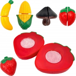 Talerzyki, miseczki, kubeczki, sztućce, dzbanek oraz owoce i warzywa do krojenia na rzep – wszystko do realistycznego serwowania i sprzątania po uczcie.