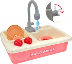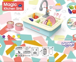 Poznaj interaktywny zlew, który po włożeniu 2× baterii AA uruchamia pompkę z obiegiem wody – dzieci mogą „naprawdę” myć naczynia, opłukiwać owoce i ćwiczyć oszczędne korzystanie z wody. Bogaty zestaw naczyń, produktów do krojenia na rzep oraz kuchennych akcesoriów rozwija wyobraźnię i umiejętności koordynacyjne.