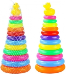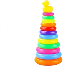 Piramida z pierścieni to klasyczna zabawka, która teraz jest dostępna w przepięknej kolorowej wersji. Pomaga rozwijać nie tylko umiejętności motoryczne i ruchowe dziecka, ale także koncentrację, manualne umiejętności i umożliwia rozpoznawanie rozmiarów, klasyfikowanie według wielkości, kolorów lub własnych zasad i logiki. Z tą kolorową zabawką, wykonaną z bezpiecznego, miękkiego plastiku, Twoje dziecko może bawić się nawet podczas kąpieli. Na szczycie piramidy znajduje się żółta kaczuszka, która dodaje jeszcze więcej urozmaicenia zabawie. Piramida z pierścieni to inwestycja na lata, która nie tylko otworzy przed dzieckiem świat wyobraźni, ale również rozwija na wielu poziomach.