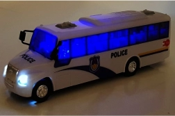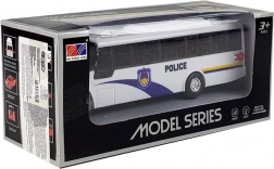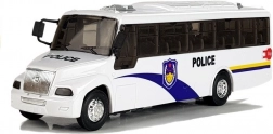 Metalowy policyjny autobus w białym kolorze zachwyca realistycznymi detalami, efektami świetlnymi i dźwiękowymi oraz jazdą z napędem typu Pull-Back. Długość 21 cm, przezroczyste okna, lusterka i srebrne kołpaki podkreślają autentyczność. Zasilanie 3× AA (brak w zestawie), odpowiedni od 3 lat.