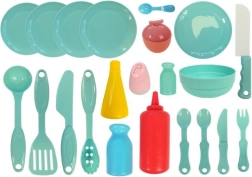 W zestawie znajduje się bogaty komplet dodatków: garnki i patelnie, zestaw obiadowy z talerzykami i filiżankami, sztućce, a także owoce i warzywa do krojenia i serwowania. Kuchnia zachęca do kreatywnej zabawy, rozwija małą motorykę, komunikację i wyobraźnię.