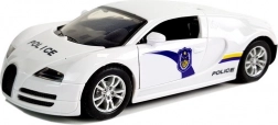 Autko wykonano z wysokiej jakości plastiku, porusza się na gumowych oponach dla lepszej przyczepności. Napęd pull-back zapewnia szybki start – wystarczy pociągnąć do tyłu i puścić. Design uzupełniają niebieskie pasy, napis POLICE oraz przyciemniane szyby, które nadają sportowy i służbowy wygląd.