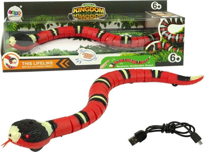 Odkryj zabawę z realistycznym wężem w czerwonym kolorze z wyrazistymi czarnymi paskami. Zabawka po zbliżeniu dłoni do głowy sama rusza, płynnie pełza, wysuwa i chowa język, a dzięki świecącym oczom sprawia zaskakująco żywe wrażenie. Świetny dla dzieci, które lubią nietypowe zabawki i chętnie zaskakują kolegów.