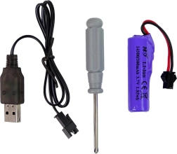 W zestawie znajdziesz akumulator 3.7 V 500 mAh, ładowarkę USB oraz narzędzie do konserwacji. Wystarczy włożyć baterie AA do pilota i ruszać.