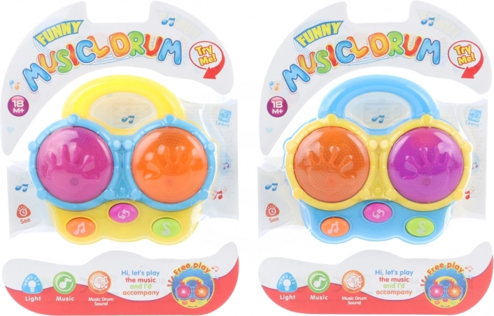 Zabawne plastikowe bębenki dla małych dzieci, które po naciśnięciu przycisków świecą i wydają wesołe dźwięki. Idealna zabawka do rozwoju rytmu i motoryki, zasilana 2 bateriami AAA (w zestawie).