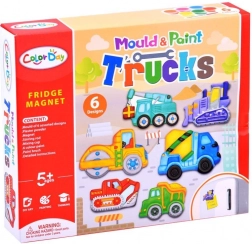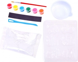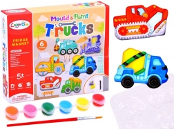 W zestawie jest wszystko, czego potrzebujesz: miseczka i mieszadełko do gipsu, pędzelek, 6 farb, taśma magnetyczna oraz instrukcja. Stworzysz aż 6 oryginalnych magnesów – spychacz, żuraw, betoniarka, walec, koparka i ciężarówka. Świetny prezent, który wspiera kreatywność, motorykę małą i cierpliwość.