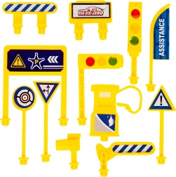W zestawie znajduje się komplet znaków drogowych i szlabanów do bezpiecznego kierowania ruchem oraz nauki zasad ruchu drogowego poprzez zabawę.