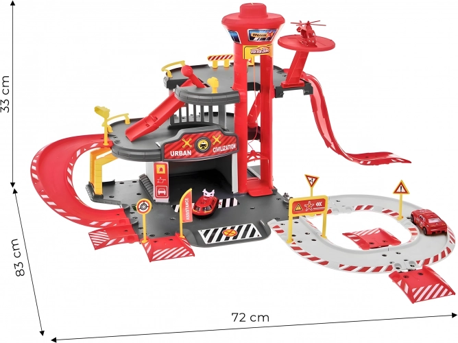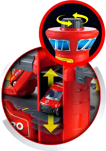Strażacki garaż, 3 poziomy z windą, auta + helikopter, 74 elementy
