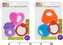 Praktyczny zestaw chłodzących gryzaków przynosi niemowlętom natychmiastową ulgę podczas ząbkowania. Gryzaki wykonane są z miękkiego, bezpiecznego materiału, niektóre wypełnione wodą destylowaną lub żelem, co po schłodzeniu w lodówce zapewnia przyjemny chłód. Ergonomiczny kształt ułatwia chwyt, masuje dziąsła oraz stymuluje dziecko wzrokowo i dotykowo. W opakowaniu znajdują się 2 gryzaki i pierścień łączący.