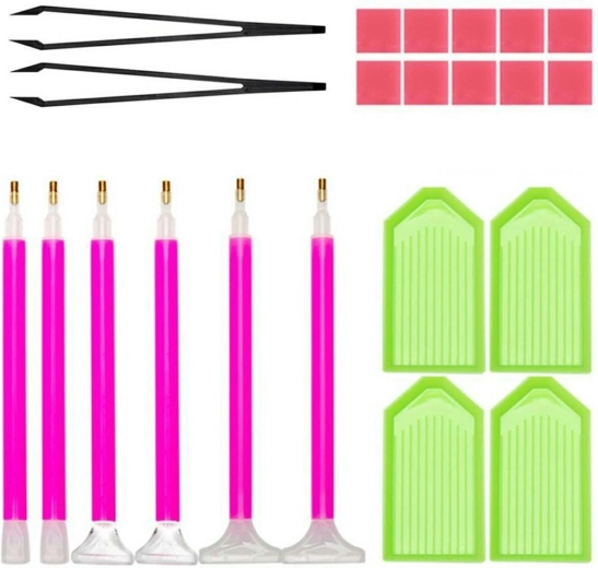 Zestaw 22 akcesoriów do diamentowego haftowania/malowania (diamond painting). Kompletny zestaw na start Twojej przygody z diamentową mozaiką. W zestawie znajduje się 6 długopisów z wymiennymi końcówkami, 2 pęsety, 4 tacki na diamenty oraz 10 kwadracików kleju.