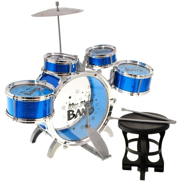 Zestaw obejmuje 5 bębnów, talerz, pedał, krzesełko i 2 pałeczki – wszystko, czego dziecięcy początkujący potrzebuje do grania.
