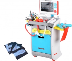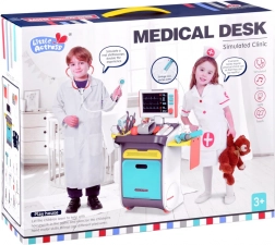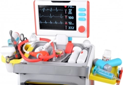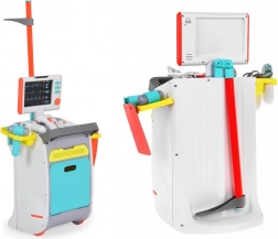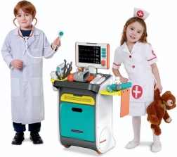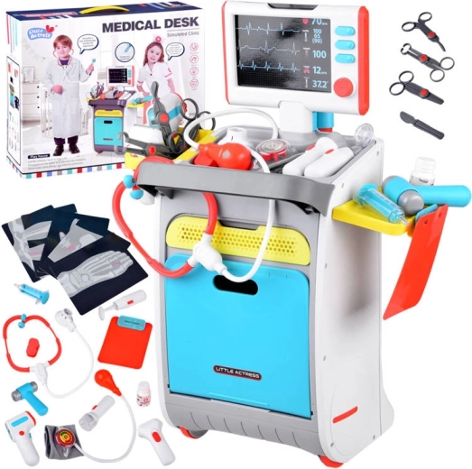 Kompletny dziecięcy zestaw lekarski na jezdnym wózku zapewnia realistyczną zabawę w doktora już od 3 lat. Zawiera interaktywne narzędzia, monitor EKG/RTG z dźwiękiem, umywalkę i sterylizator narzędzi, odkładane półki i szuflady oraz miarkę wzrostu do 112 cm. Solidne wykonanie i żywe kolory wspierają kreatywną i edukacyjną zabawę.