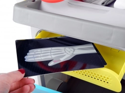 - Realistyczne akcesoria: panel EKG/RTG z dźwiękiem, miarka wzrostu, sterylizator, półki i pojemniki na narzędzia.