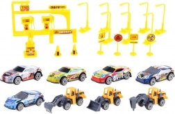 W komplecie 5 samochodów osobowych, 3 maszyny budowlane oraz oznakowanie drogowe. Dzieci zbudują kompletny świat z parkingiem, stacją paliw i elementami drogowymi.