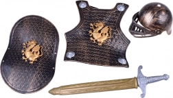 Zbroja, hełm z ruchomą przyłbicą, tarcza i miecz z pochwą – wszystko, czego mały rycerz potrzebuje do wielkich przygód i karnawałowych przebieranek.