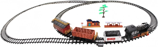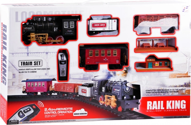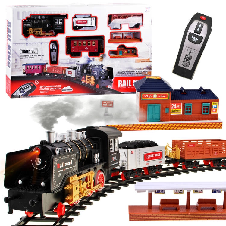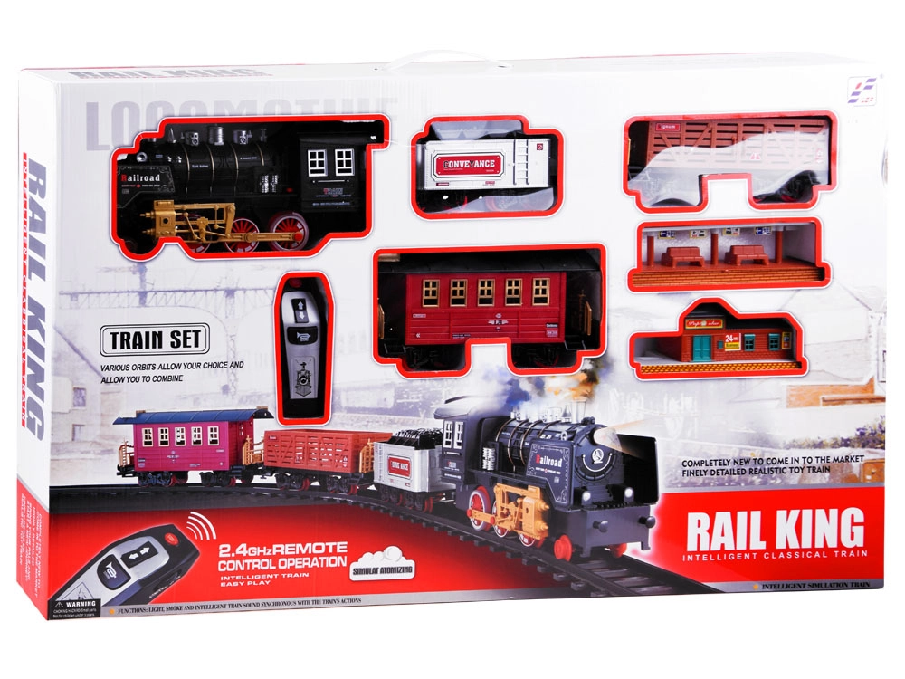 Ciesz się klasyczną kolejową zabawą z realistyczną lokomotywą parową na zdalne sterowanie. Pociąg oferuje efekty świetlne, dym z komina, autentyczne dźwięki oraz płynne przyspieszanie i zwalnianie. Duży owalny tor z akcesoriami zmieni każdy pokój w małą stację kolejową.