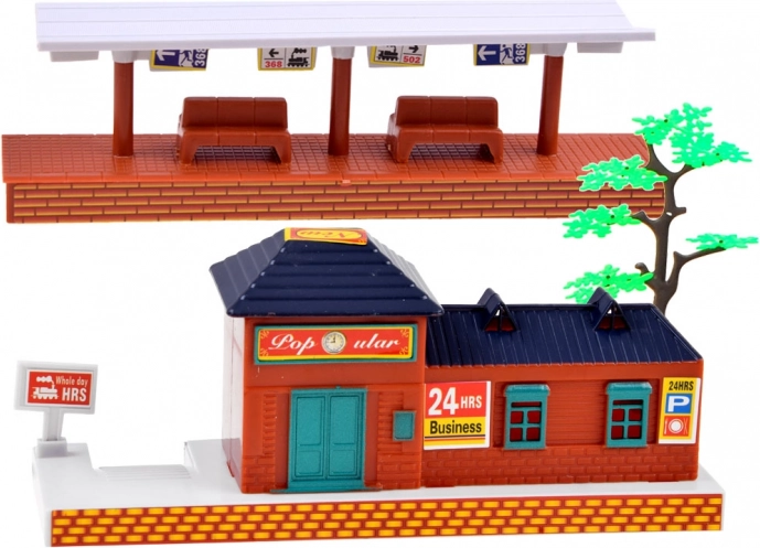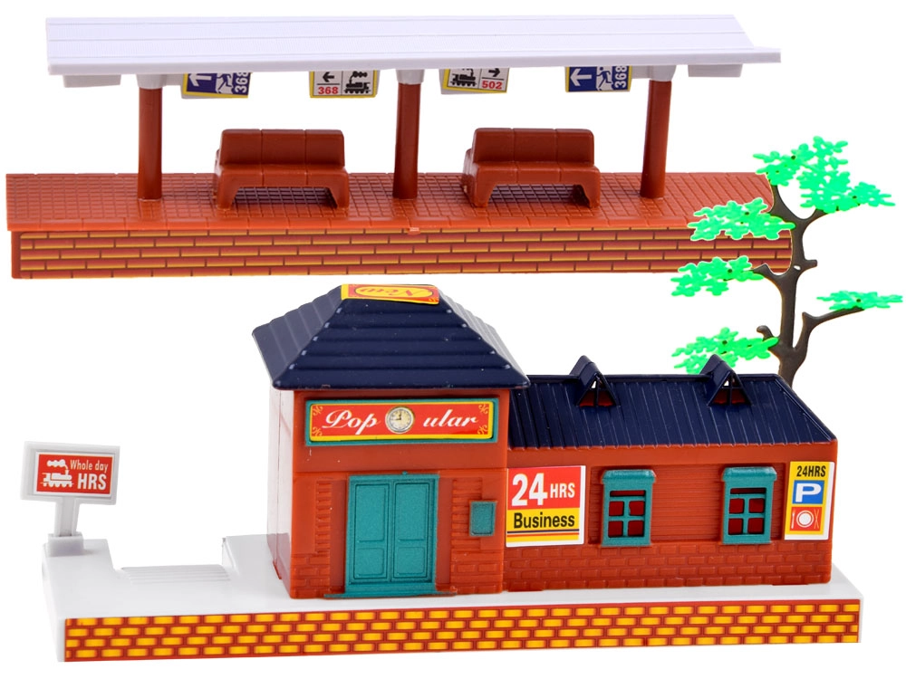 Złóż tor o wymiarach 213 × 120 cm z 22 elementów szyn, dodaj stację, poczekalnię i drzewa, aby stworzyć własną scenę kolejową.