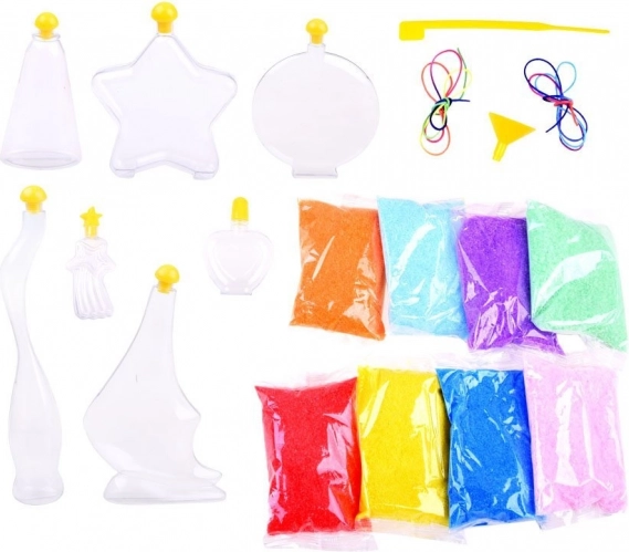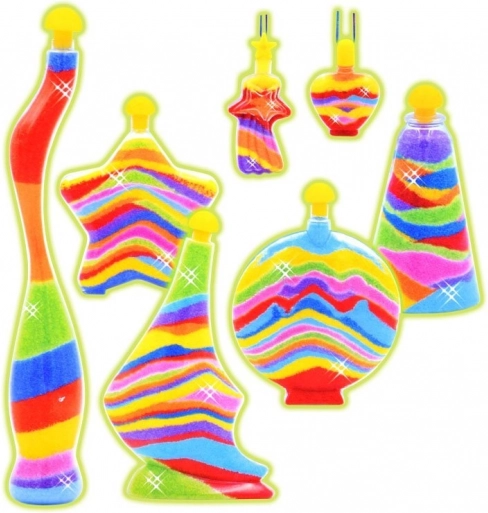 Kompletne opakowanie z buteleczkami, breloczkami, 8 kolorami piasku i akcesoriami pozwala zacząć tworzyć od razu po rozpakowaniu.