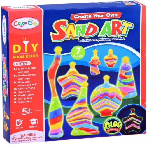 Ten kompletny zestaw zawiera wszystko, czego potrzebujesz do tworzenia wyjątkowych dekoracji: plastikowe buteleczki i breloczki w zabawnych kształtach, 8 saszetek z kolorowym piaskiem, lejek i łopatkę do wygodnego wsypywania, kolorowe sznureczki oraz instrukcję. Gotowe prace ozdobią pokój dziecka lub sprawdzą się jako miły, ręcznie wykonany prezent.