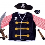 Stylowy dziecięcy piracki kostium na bal przebierańców, karnawał i Halloween ucieszy każdego małego poszukiwacza przygód. W zestawie ikoniczne dodatki: piracki kapelusz, miecz, teleskopowa luneta, opaska na oko oraz bluza w paski. Kostium jest wygodny, lekki i odpowiedni dla dzieci od 3 lat.