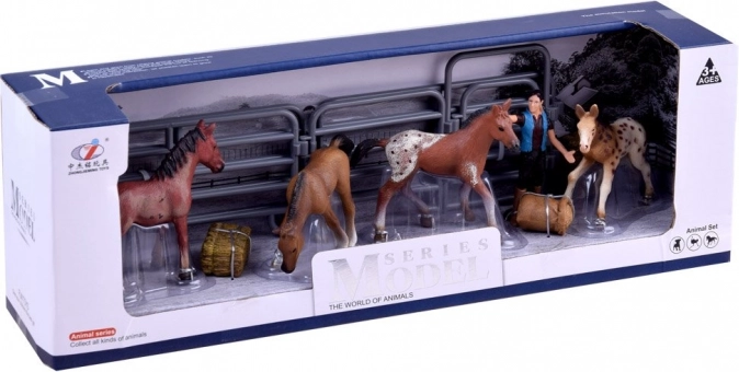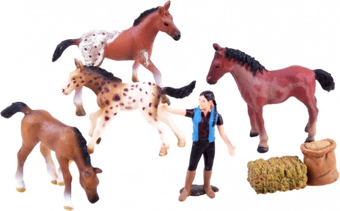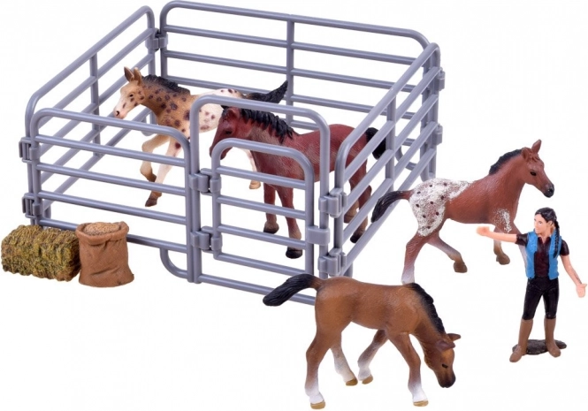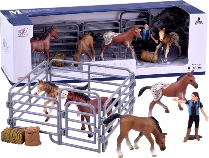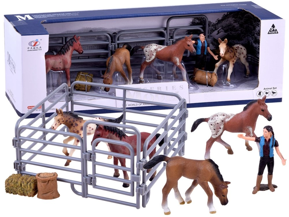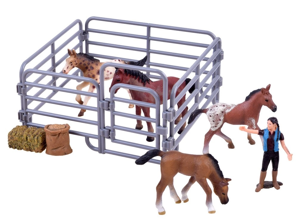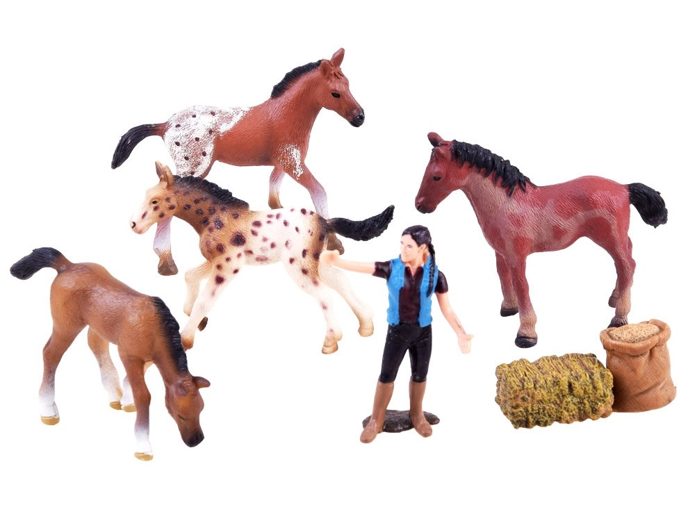Ręcznie malowany zestaw koników z zagrody: 4 źrebięta, gospodyni, zagroda i akcesoria. Realistyczne detale, kreatywna i edukacyjna zabawa. Świetny prezent.