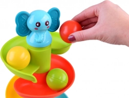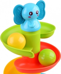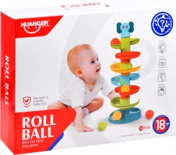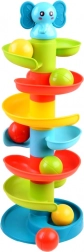 Ta kolorowa spiralna kulodrom z sympatycznym słonikiem na szczycie natychmiast przyciąga uwagę dzieci. Sześć kolorowych platform tworzy płynny tor, po którym kulki żwawo się toczą, przyjemnie grzechocząc. Słonik ma miękkie gumowe uszko odpowiednie jako delikatny gryzak dla ząbkujących maluchów.