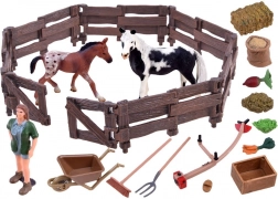 Skrzynki z warzywami, worek ze zbożem i belka siana uzupełnia zamykana zagroda dla kompleksowej opieki nad końmi.