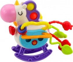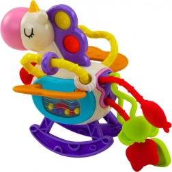 Koń jest wyposażony w miękkie gumowe elementy idealne do gryzienia i poznawania różnych faktur, a także w grzechotki, które po potrząśnięciu wydają przyjemne dźwięki, stymulując słuch i koordynację ruchową.