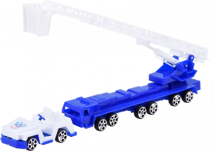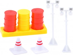 Przyczepa z wysuwaną drabinką oraz realistyczne akcesoria, takie jak światła i pachołki, które wzbogacają zabawę.