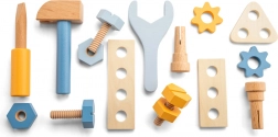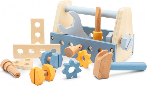 Ten ponadczasowy drewniany zestaw narzędzi pozwala dzieciom bawić się w prawdziwych rzemieślników. Dzięki otworom w skrzynce mogą ćwiczyć dokręcanie śrub i mocowanie nakrętek, rozwijać wyobraźnię przestrzenną oraz uczyć się logicznego myślenia. Wysoka jakość wykonania i przyjemne materiały zapewniają długą żywotność i bezpieczne użytkowanie.
