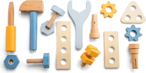 W zestawie znajduje się 16 funkcjonalnych elementów: młotek, śrubokręt, klucz, gwoździe, śruby oraz koła zębate do nieskończonych wariantów zabawy. Produkt wykonany z certyfikowanego drewna FSC, co stanowi zrównoważony wybór dla rodziców i planety.