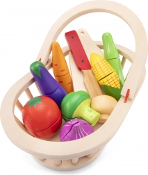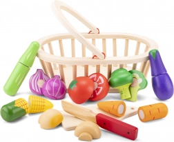 W zestawie znajduje się koszyczek do łatwego przechowywania i przenoszenia, deska oraz drewniany nóż. Kolorowe elementy warzyw – pomidor, marchewka, brokuł, bakłażan, cebula, kukurydza, pieczarki i ogórek – zachęcają do odkrywania i nauki o zdrowym odżywianiu.