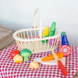 Koszyczek, deska i nóż wraz z bogatym wyborem warzyw ułatwiają przechowywanie i przenoszenie oraz zachęcają do realistycznych zabaw w dziecięcej kuchni.