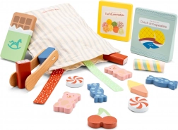 Uroczy drewniany zestaw słodyczy dla dzieci od 3 lat oferuje bezpieczną i kreatywną zabawę. Zawiera 16 smakołyków, szczypczyki i materiałową torbę. Wspiera małą motorykę, wyobraźnię oraz umiejętności społeczne. Wykonany w 100% z certyfikowanego drewna FSC dla długiej trwałości i troski o naturę.
