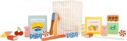 - 16 drewnianych smakołyków, drewniane szczypczyki, materiałowa torba