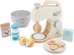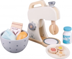Ten piękny drewniany zestaw zawiera realistyczny mikser stojący z obrotową trzepaczką, drewnianą miską oraz bogatymi akcesoriami: mąką, cukrem, dzbankiem mleka, dwiema połówkami jajek i talerzykiem z trzema ciasteczkami. Dzieci mogą naśladować pieczenie i przygotowywanie smakołyków jak prawdziwi piekarze.
