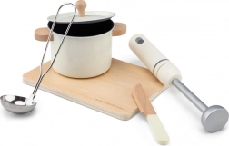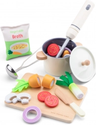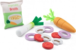 W zestawie znajduje się bogata paleta składników: marchewka, por, czerwona cebula, plastry pomidorów i grzybów oraz materiałowa torebka z „bulionem warzywnym”. Dzieci mogą testować własne przepisy, nabierać gotową zupę chochlą i serwować ją jak prawdziwi szefowie kuchni.