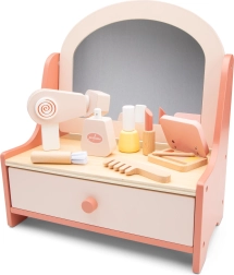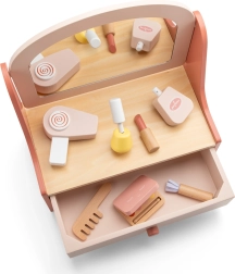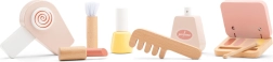 Zestaw zawiera drewniane akcesoria takie jak szczotka, szminka, flakon perfum, suszarka, lakier do paznokci, paleta cieni do powiek i pędzel, wspierające kreatywną zabawę.