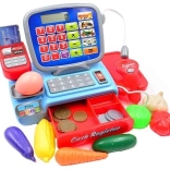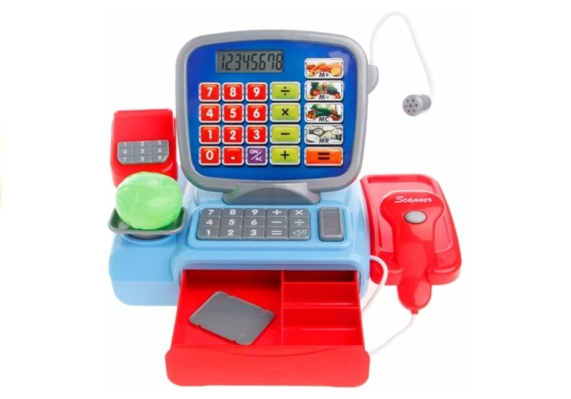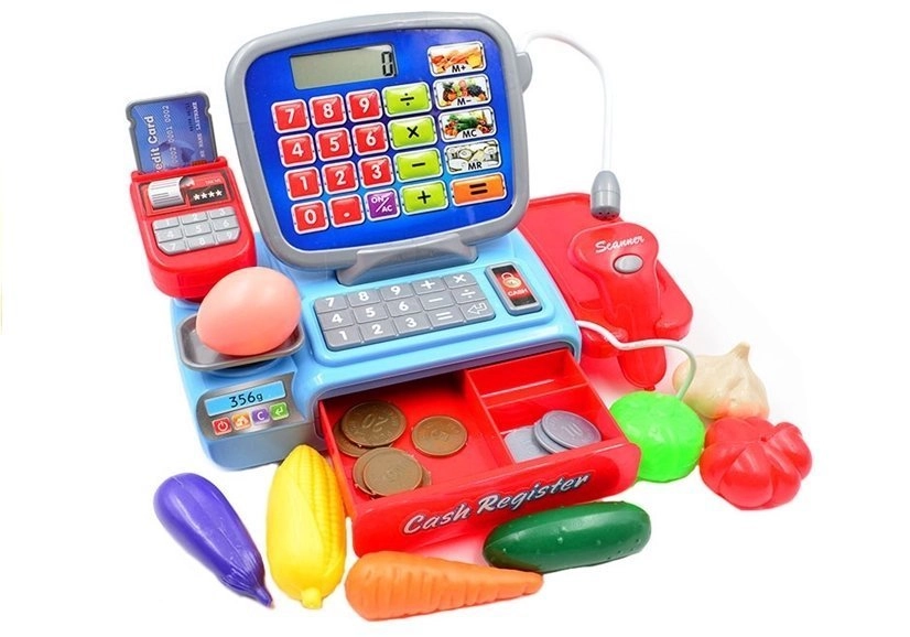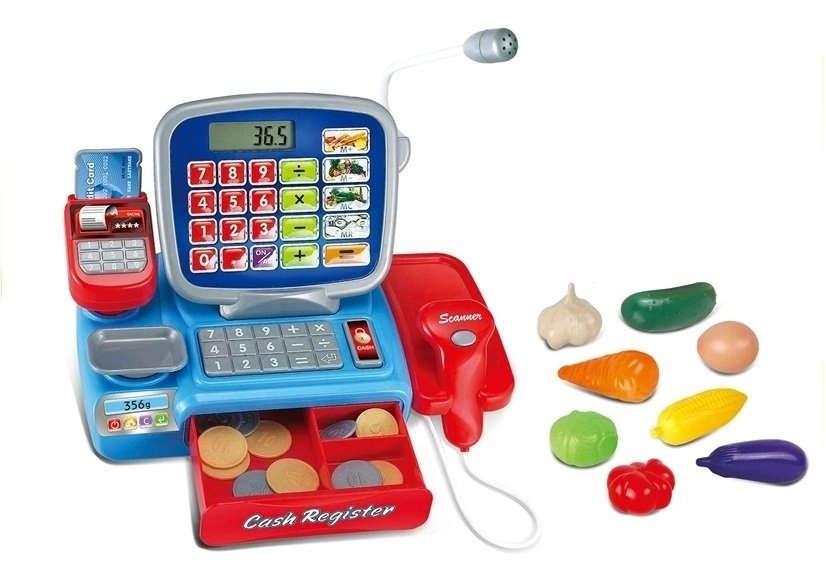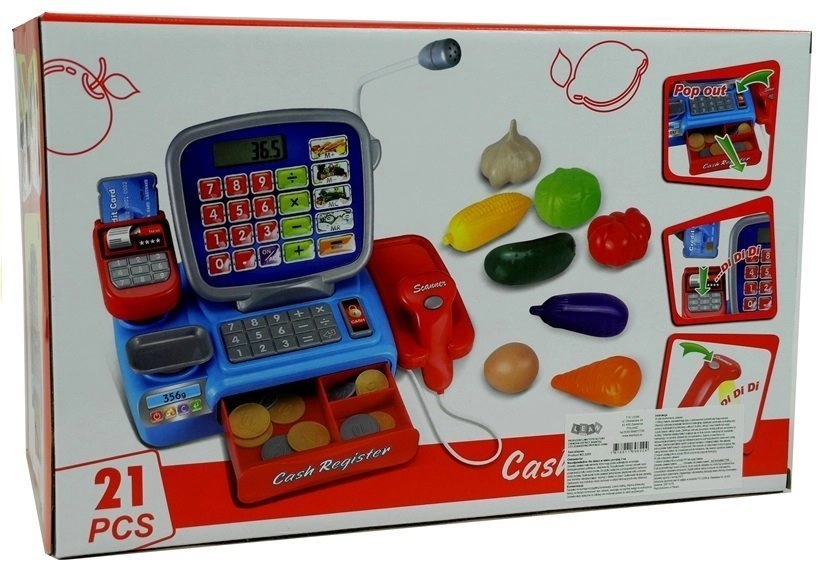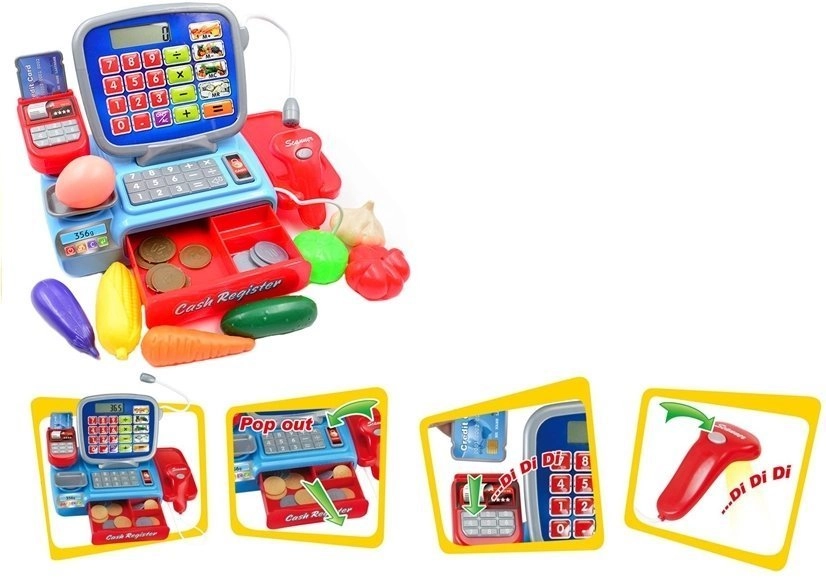 Funkcjonalna kasa jest idealna do nauki liczenia, sprzedaży i zakupów. Elektroniczna kasa ma działający skaner, który po naciśnięciu wydaje dźwięki i zapala się. Kasa pełni też funkcję kalkulatora – możesz dodawać ceny produktów i uczyć się liczyć. Kasa ma imitację mikrofonu oraz wysuwaną szufladę na monety. Obok kasy znajduje się waga, na której można ważyć dołączone produkty spożywcze. Dziecko może przyjmować płatność kartą i płacić monetami.