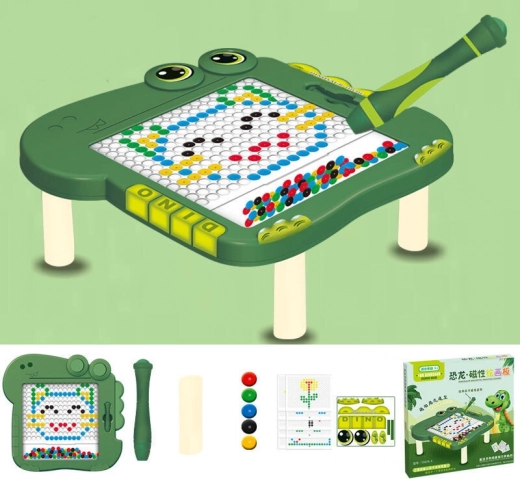 Odkryj magnetyczną tablicę, która zamienia naukę w zabawę. Dzięki przezroczystemu okienku z kolorowymi koralikami (czarne, zielone, niebieskie, czerwone i żółte) oraz magnetycznemu rysikowi dzieci łatwo układają wzory, litery lub proste obrazki. Zielony dinozaurzy design od razu podbije serca małych twórców.